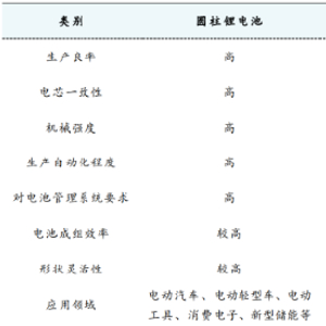 作为技术路线之一,大圆柱电池有望促进动力电池技术的迭代升级。具体来看,相较于方形锂电池和软包锂电池而言,圆柱锂电池具有生产良率高、一致性好、生产自动化程度高等优势,在电动汽车领域优势显著,有望成为中高端电动车的最优解。