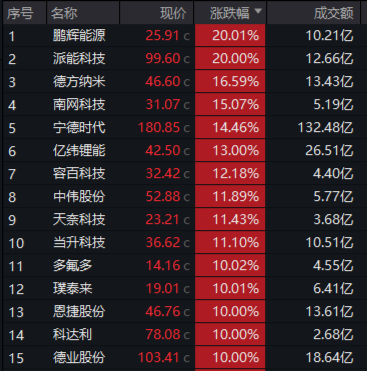 3月11日,锂电板块大放异彩!创业板一哥宁德时代涨超14%,引发电池板块涨停潮。鹏辉能源、派能科技20%涨停,德方纳米、南网科技、亿纬锂能、容百科技等多股涨超10%,更有多氟多、璞泰来、科达利、天赐材料等多股10cm涨停。