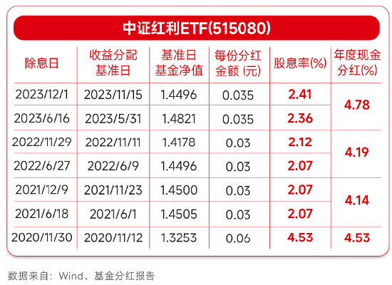 事实上,中证红利ETF(515080)成立以来一直坚持稳定、高频分红。根据基金公告,截至去年底,成立以来该ETF已累计7次实施分红,区间分红频次居A股权益类ETF第一。