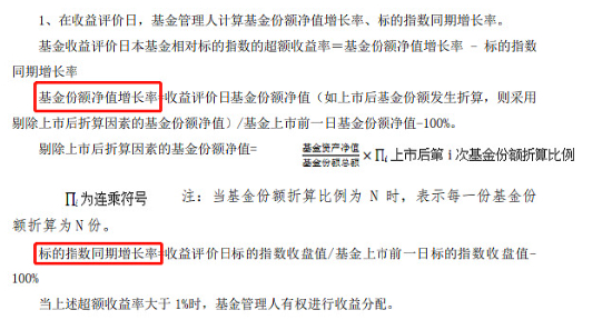 关于这点,收益分配条款上写的是:基金收益评价日核定的基金份额净值增长率超过标的指数同期增长率达到 1%以上时,可进行收益分配。
