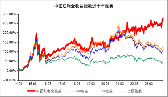 截至3月8日,近十年来,中证红利全收益指数涨幅264%,年化收益率为14.19%,跑赢同期300收益(7.54%)、50收益(8.45%)。