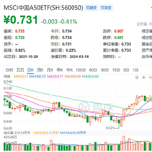 热门ETF方面,A50中规模最大的MSCI中国A50ETF(560050)今日回调小跌0.41%,最新价报0.731元,全天成交额1.54亿元,交投活跃度高居同类第一,全天多数时间持续溢价,显示资金逢跌再度净流入!