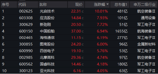 图:国防军工ETF(512810)标的指数成份股涨幅TOP10