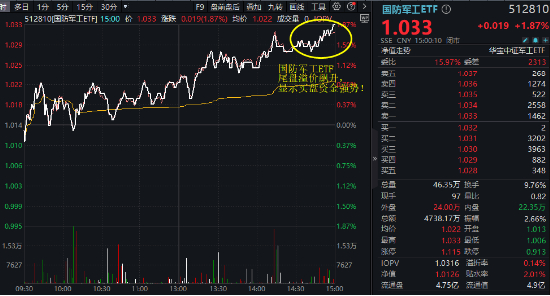 二、【中船系全线走强,低空经济热度不减,国防军工ETF(512810)续涨1.87%收于日内高点!尾盘溢价飙升!】