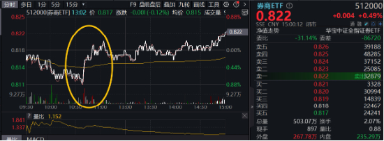 盘面其他方面,近期走势波折的券商板块盘中迎来一波异动,券商ETF(512000)直线拉升,方正证券董事长施华在业绩说明会上回应了与平安证券整合的进展情况:“有序推进相关工作”,方正证券盘中一度涨超5%。
