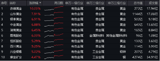 今日金价飙升,贵金属领涨市场,中证有色金属指数涨幅前5大成份股均是黄金股,其中,赤峰黄金涨停封板,山东黄金飙涨近8%。值得注意的是,中证有色金属指数第一大成份股紫金矿业劲涨4.47%,股价叕创历史新高。