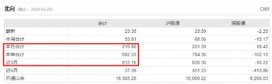 与之相伴的,是外资真金白银的买入。最近两个月,北向资金再度大举流入A股。数据显示,截至3月28日收盘,北向资金年内累计净流入额已达682.23亿元,大幅超过2023年全年(437亿元)。