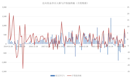 上图展示了自2014年至今,北向资金的月度净买入额以及沪指涨跌幅数据。乍一看,北向资金似乎确实对买卖时点具有一定把控能力。