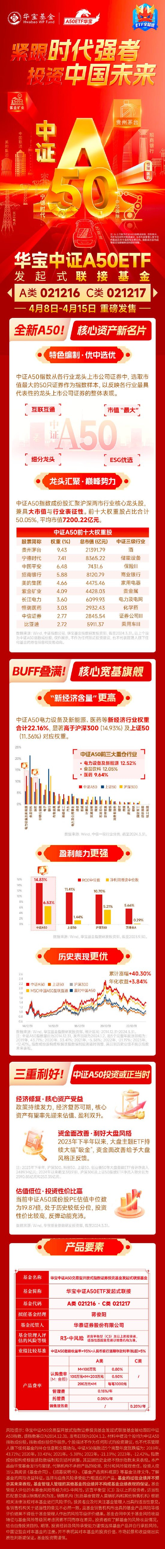 4月8日,全球最大钢铁集团、央企中国宝武集团旗下的金融板块子公司——华宝基金旗下的“华宝中证A50ETF联接基金”(A类份额代码021216;C类份额代码021217)重磅开售。据悉,“华宝中证A50ETF联接基金”主要通过投资于华宝中证A50ETF(简称:A50ETF华宝;代码:159596),紧密跟踪标的指数。