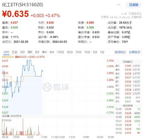 今日(4月8日),化工板块再度走强。反映板块整体走势的化工ETF(516020)盘中最高价创下2023年11月23日以来新高,截至发稿,场内价格涨0.47%。