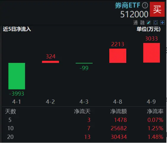 上交所数据显示,券商ETF(512000)最新单日再获资金净流入3033万元,拉长时间看,近10日、20日资金分别累计净流入2.57亿元、3.04亿元,资金密集加码。