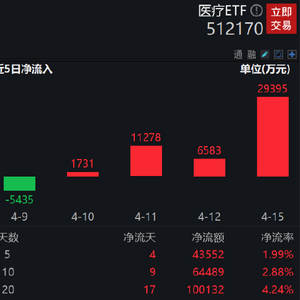 3月中旬以来,医药医疗板块再度进入下行通道,同期资金关注度异常高企。从资金净流入方面来看,Wind数据显示,截至4月15日,医疗ETF(512170)连续4天获得资金净流入,最高单日获得2.94亿元净流入,4日合计“吸金”4.9亿元。