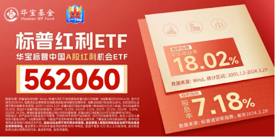 标普红利ETF(562060)被动跟踪标普中国A股红利机会指数(CSPSADRP),根据其最新月报数据,截至2024年3月29日,标普中国A股红利机会指数(CSPSADRP)股息率高达7.18%,,2005年以来年化收益率更是超18%。在经济增速适度放缓和无风险利率下行的宏观背景下,标普红利ETF(562060)以持续稳定的高股息和跨越周期的盈利能力,展现出突出的配置价值。