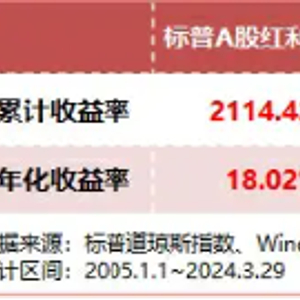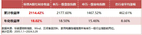 2005年以来的20个年份(截至2024.3.39),标普A股红利全收益指数累计上涨了2114.42%,这一成绩跑赢了同期除食品饮料(2177.60%)外的所有30个申万一级行业,较各行业平均涨幅跑赢1651个百分点。