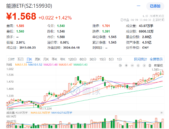 拉长时间看,截至2024年4月19日,能源ETF(159930)本周累计上涨4.6%,周线5连阳!