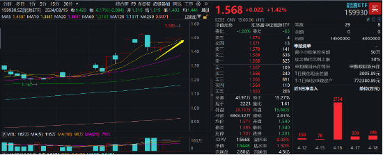 热门ETF方面,全市场唯一、仅含24只石油股和煤炭股的能源ETF(159930)逆市大涨1.42%,再创2015年6月以来新高,收盘价报1.568元,全天成交额已超6900万元,换手率15.27%。
