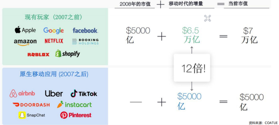 在前几个技术革命中,很多公司市值都有十倍以上的增长。像移动互联网开始的时候,苹果、谷歌、Facebook等等这些公司,总共市值加起来是5000亿,移动互联网让这些公司有了12倍的增长。按照这个推理,大概10年以后人类会出现第一个市值超10万亿美金的公司。