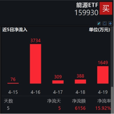 从资金净流入方面来看,截至4月19日能源ETF(159930)近7天获得连续资金净流入,最高单日获得3734万元净流入,合计“吸金”6681万元,日均净流入达954万元,加上今天资金逢跌加仓全天净流入750万份,能源ETF(159930)已经连续8日吸金,合计高达7830万元。