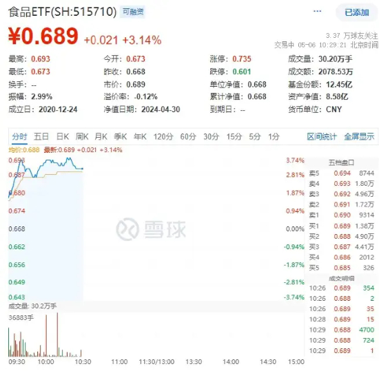 吃喝板块再度爆发!今日(5月6日),吃喝板块高开高走,反映板块整体走势的食品ETF(515710)场内价格涨幅一度高达3.74%,后小幅回落,截至发稿,涨3.14%。