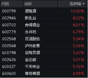 成份股方面,白酒集体狂欢!酒鬼酒强势涨停,舍得酒业飙涨超8%,水井坊涨超6%,泸州老窖大涨超5%,贵州茅台、五粮液、山西汾酒、洋河股份等白酒龙头亦集体飙升。