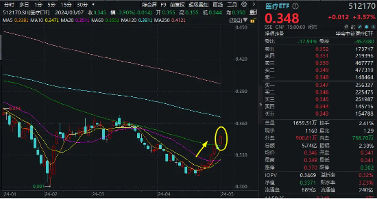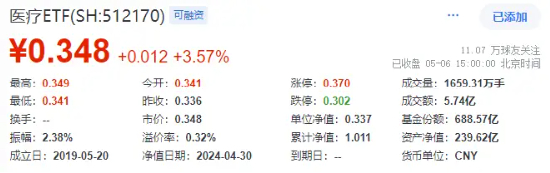 “五一”假期后首个交易日(5月6日),医疗板块再度起势,领涨大市!232亿体量医疗ETF(512170)早盘跳空高开,全天维持高位,场内价格收涨3.57%!成交大幅放量,全天成交额达5.74亿元,较前一交易日激增逾6成!