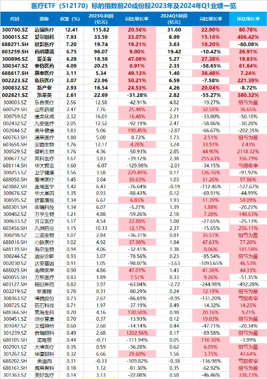 图片来源于iFinD、沪深交易所、华宝基金,截至5月6日。风险提示:医疗ETF(512170)及其联接基金被动跟踪中证医疗指数,该指数基日为2004.12.31,发布于2014.10.31,指数成份股构成根据该指数编制规则适时调整。文中指数成份股仅作展示,个股描述不作为任何形式的投资建议,也不代表管理人旗下任何基金的持仓信息和交易动向。中证医疗指数2019年至2023年的分年度业绩分别为48.67%、79.67%、-14.71%、-25.1%、-24.25%,标的指数成份股构成根据该指数编制规则适时调整,其回测历史业绩不预示指数未来表现。基金管理人评估的本基金及其联接基金的风险等级分别为R3-中风险、R4-中高风险,分别适宜平衡型(C3)、积极型(C4)及以上投资者,适当性匹配意见请以销售机构为准。任何在本文出现的信息(包括但不限于个股、评论、预测、图表、指标、理论、任何形式的表述等)均只作为参考,投资人须对任何自主决定的投资行为负责。另,本文中的任何观点、分析及预测不构成对阅读者任何形式的投资建议,亦不对因使用本文内容所引发的直接或间接损失负任何责任。基金投资有风险,基金的过往业绩并不代表其未来表现,基金管理人管理的其他基金的业绩并不构成基金业绩表现的保证,基金投资需谨慎。