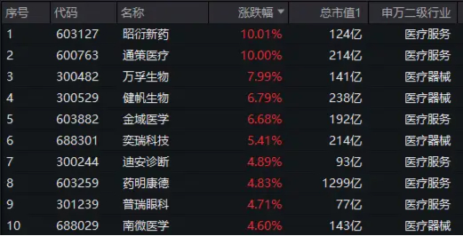 图:医疗ETF(512170)标的指数成份股涨幅TOP10