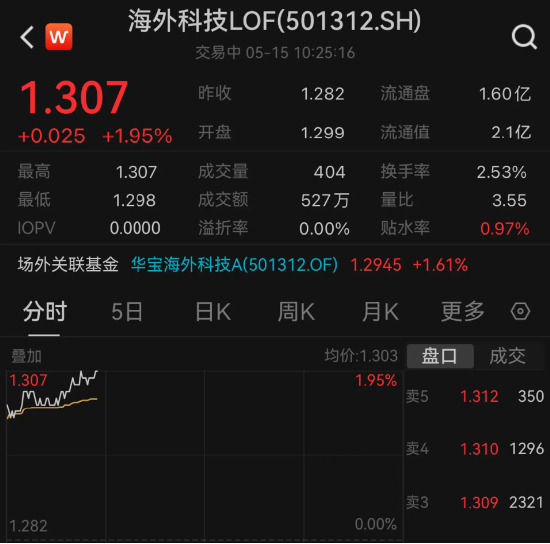 A股方面,今日(5月15日),“投资海外颠覆性科技”的热门QDII基金——海外科技LOF(501312)场内高开高走,现场内价格涨近2%,实时涨幅居两市LOF基金涨幅排行榜前三!