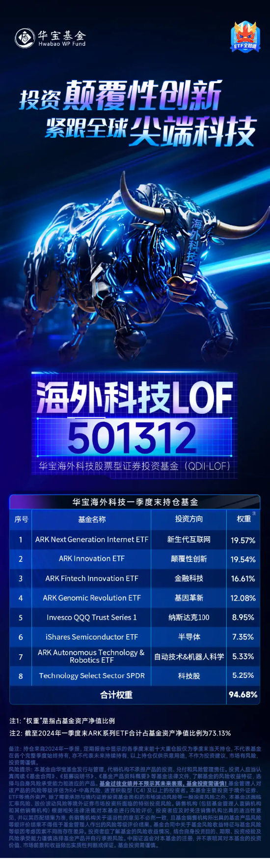 基金一季报显示,截至2024.3.31,海外科技LOF(501312)持仓基金包括5只ARK系列ETF,合计占基金资产净值比例超73%,主要投向新生代互联网、颠覆性创新、基因革新、金融科技等前沿科技领域。另外3只则投向纳斯达克100、美股半导体龙头和其他科技股。