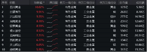 核心权重股紫金矿业股价上探历史新高(19.79元),全天豪涨3.67%;四川黄金、白银有色涨停封板,兴业银锡盘中多次触及涨停,收盘大涨9.35%。