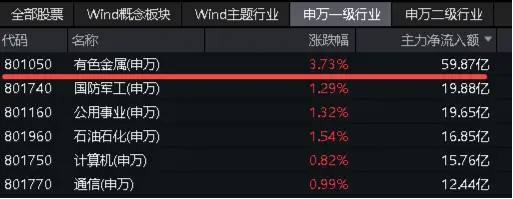 资金面上,今日主力资金最青睐有色金属板块,全天净流入59.87亿元,霸居31个申万一级行业首位。