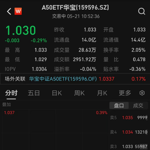 5月21日,截止10:52,A50ETF华宝(159596)跌0.29%,成交额2951.92万元。