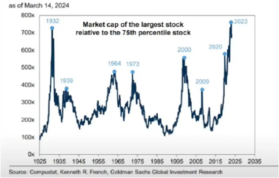 纳斯达克100指数(ETF是QQQ),但由于前七个科学巨子(分别是微软、苹果、英伟达、谷歌、亚马逊、博通、META,注意特斯拉已经不在最大七个里了)这七个占了44%的权重,所以与其说纳斯达克100指数,其实你说是它是纳斯达克7指数,问题也不大。下图反映了历史上市场前25%的大盘股,对于市场后75%的中小盘股的市值比例的变化,大对于小的悬殊差距,已经是历史极值区间。