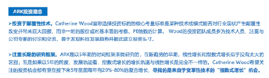打工到顶,遂出街自立门户,定都佛州,由挚友韩国小岳岳出资,创立Ark Invest,专攻disruptive innovation。至于为何叫ARK诺亚方舟,自然是因为木头姐是一个热忱基督徒,诺亚方舟的圣经故事。