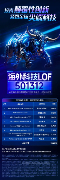 华宝海外科技LOF501312,直投海外科技巅峰,高纯度聚焦海外科技资产:除了ARK旗舰科技ETF,海外科技LOF投资方向还包括芯片巨头、美科技巨头及纳指100等,前8只持仓基金全部投向美股核心科技资产,高纯度聚焦海外科技。