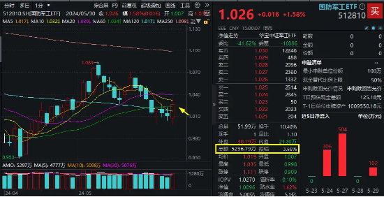 国防军工ETF512810早盘持续走高,涨幅一度升至2.28%,午后涨幅有所收窄,场内价格最终收涨1.58%,收复60日线和半年线!全天振幅达3.66%。场内交投尤为活跃,全天成交5297万元,较昨日放量逾三成
