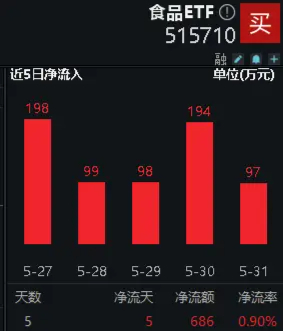 有很多资金已经意识到了这一点,趁着近几天板块回调之际加速逢低吸筹。以食品ETF(515710)为例,数据显示,截至5月31日,食品ETF(515710)已连续6日获资金加仓,且近5日累计加仓金额近700万元。
