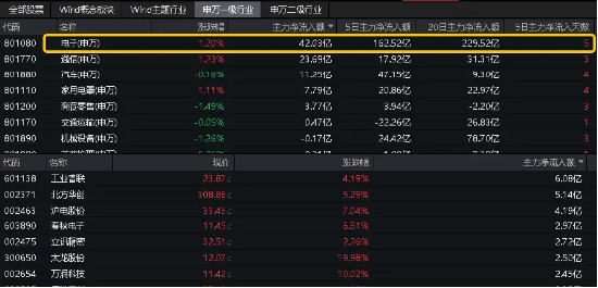 资金面上,电子板块全天获主力资金净流入42.03亿元,霸居31个申万一级行业榜首,拉长时间来看,近5日电子板块连续获主力资金加仓,累计净流入162.52亿元,近20日累计净流入229.52亿元,均位于全行业首位!反映资金持续看好电子板块后市表现