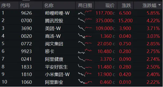 今日港股表现较强,三大指数齐升互联网龙头霸气领涨,哔哩哔哩涨近6%,腾讯控股涨超4%,美团涨逾3%,小米集团涨超2%。此外,阿里健康、商汤、阅文集团、平安好医生等涨幅居前。