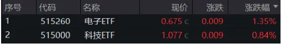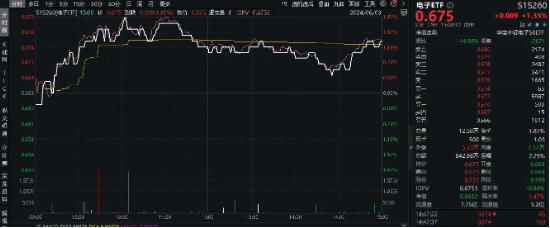 热门ETF方面,紧密跟踪电子50指数的电子ETF(515260)低开高走,震荡上扬,场内价格早盘一度上探1.95%,下午大盘拖拽,涨幅略有缩窄,尾盘再度发力,收涨1.35%,一举收复10日、20日、60日三根均线。