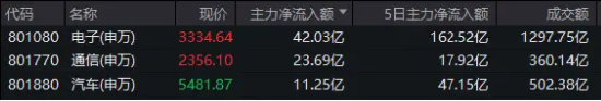 主力资金动向上,硬科技板块今日备受资金青睐。今日电子、通信行业分别获主力净流入42.03亿元、23.69亿元,分别居31个申万一级行业主力资金净流入排行榜第一、第二位!