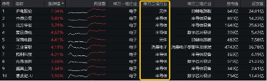 或由于英伟达“全球最强芯片”宣布开始投产,今日半导体再度活跃,电子50指数涨幅前十大成份股中,半导体行业个股占7位,其中,中微公司、北方华创涨逾5%,工业富联、寒武纪-U等个股亦涨超3%。值得注意的是,沪电股份飙涨7.04%,盘中股价创历史新高(34.28元)。