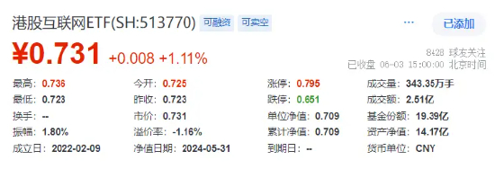 重仓港股互联网龙头的港股互联网ETF(513770高开高走,场内价格最高涨近2%,收涨1.11%终结此前日线4连阴