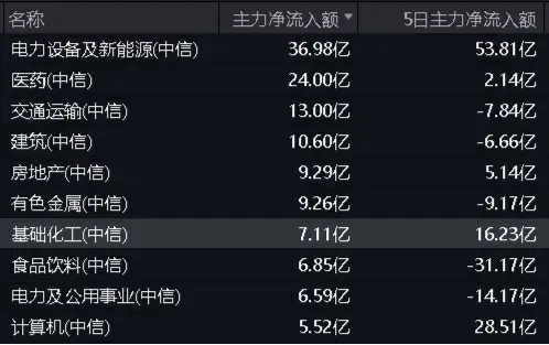 主力资金方面,Wind数据显示,昨日,基础化工板块获主力资金净流入7.11亿元,净流入额在30个中信一级行业中位居第7;截至昨日收盘,近5日,基础化工板块获主力资金净流入16.23亿元,净流入额亦高居全行业(中信一级)前10。