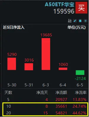 值得关注的是,核心龙头宽基资金动向也印证了市场偏好或正转向大盘风格。数据显示,截至65日,龙头宽基A50ETF华宝(159596)近20日内有15日获净申购,累计净流入5.48亿元,净流入率达44.62%