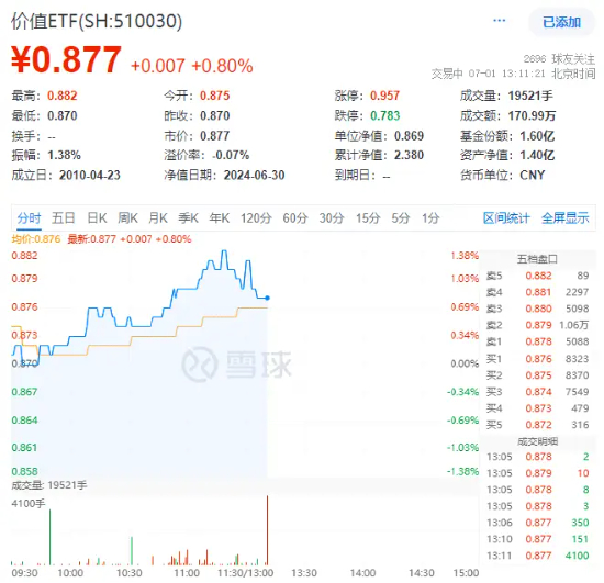 今日(7月1日),高股息延续强势,叠加地产行情强势回归,带动聚焦“高股息+低估值”大盘蓝筹股的价值ETF(510030)场内价格大涨,其最高上探1.35%,后略有回落,截至13:11,涨0.8%。