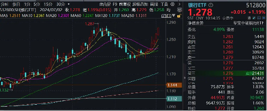 板块顶流ETF——银行ETF(512800)低开高走,场内价格现涨1.19%,实时成交额超9000万元,冲击日线7连阳。