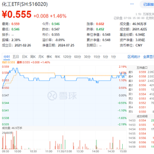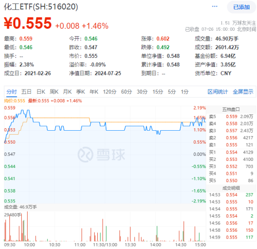 今日(7月26日),化工板块开盘直线冲高,而后略有回落,尾盘再度小幅拉升。反映化工板块整体走势的化工ETF(516020)盘中场内价格最高涨超2%,截至收盘,涨1.46%。