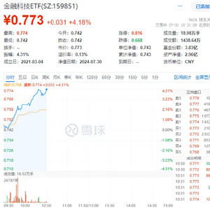 31日早盘,金融科技全线飙涨,财富趋势触及涨停,艾融软件涨超14%,指南针大涨超11%,恒银科技率先封板,银之杰上涨超9%,同花顺、赢时胜涨超6%。板块代表ETF——金融科技ETF(159851)场内价格飙涨超4%,冲击日线五连阳,成交额达超1400万元。