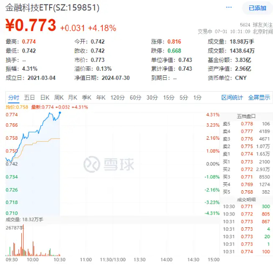 金融科技全线飙涨!财富趋势触及涨停,恒银科技封板,金融科技ETF(159851)拉升超4%冲击五连阳